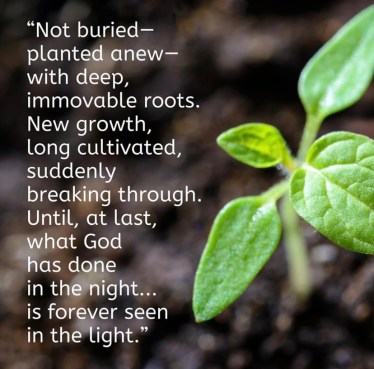 In the dark … under the quiet cover of night, kept from the enemy’s sights and snares, God prepares His most lethal weapons. Hell’s banishment becomes heaven’s promotion. Not buried, but planted anew with deep immovable roots. New growth, long cultivated, suddenly breaking through. Until, at last, what God has done in the night …